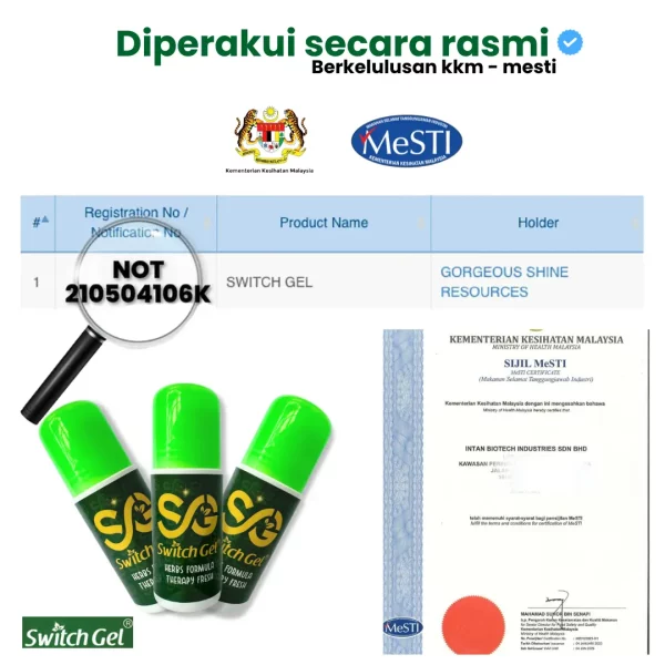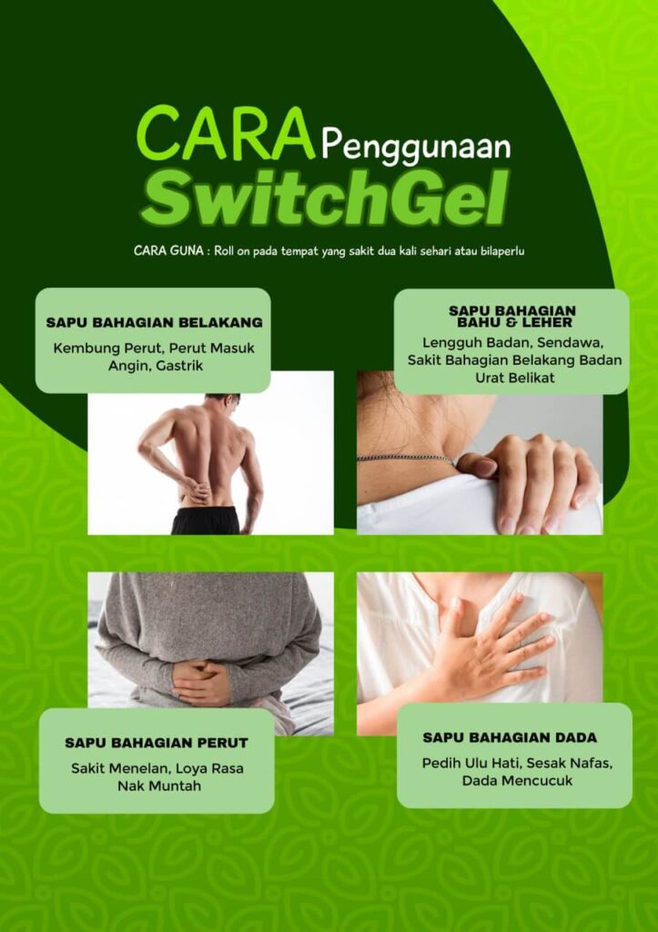 • Tidak ada kesan sampingan dan 100% selamat untuk ibu dan bayi dalam kandungan kerana Switch Gel hanya untuk penggunaan luaran sahaja.
